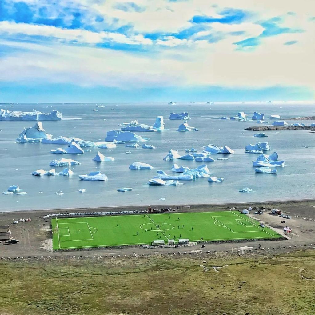 La liga de Groenlandia, llamada Coca Cola GM, es una de las mas cortas del mundo, su fase final dura una semana y en ella participan ocho equipos clasificados tras los enfrentamientos regionales. Las condiciones climáticas provocan que los campos sean de césped artificial como este situado en Qeqertarsuak.