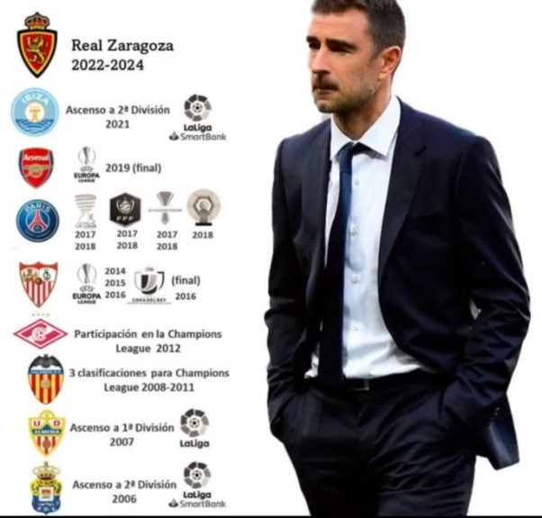 En el Real Zaragoza no ha conseguido plasmar esta metodología. En 10 jornadas el equipo solo ha conseguido 2 victorias y ha marcado 5 goles, sumando un total de 10 puntos, que supone una puntuación de descenso a Primera RFEF.