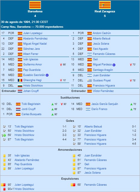 En 1994 se enfrentó al FC Barcelona y perdió 0-2 en La Romareda y venció 4-5 en el Camp Nou.