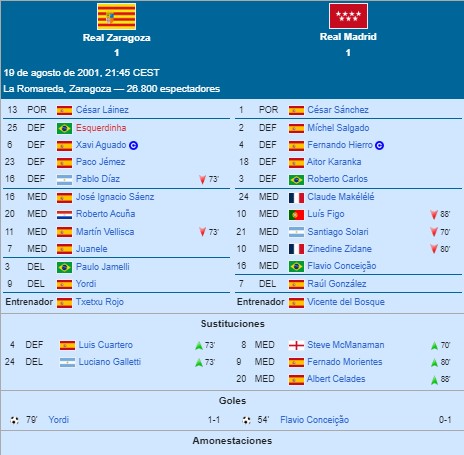 Su segunda participación, en 2001, volvió a terminar en derrota, en esta ocasión ante el Real Madrid. Pese al empate a un gol en La Romareda poco pudo hacer el Real Zaragoza en el Santiago Bernabeu, Raúl González marcó un hat-trick para poner el 3-0 en el marcador.