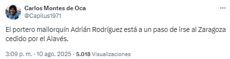 CARLOS MONTES DE OCA Rumores sobre fichajes del Real Zaragoza adelantados por Carlos Montes de Oca (@Capilus1971) ADRIÁN RODRÍGUEZ Comparte esto: Haz clic para compartir en X (Se abre en una ventana nueva) X Haz clic para compartir en Facebook (Se abre en una ventana nueva) Facebook Haz clic para compartir en WhatsApp (Se abre en una ventana nueva) WhatsApp Haz clic para compartir en Pinterest (Se abre en una ventana nueva) Pinterest Haz clic para compartir en Telegram (Se abre en una ventana nueva) Telegram Más Haz clic para enviar un enlace por correo electrónico a un amigo (Se abre en una ventana nueva) Correo electrónico Me gusta Cargando...