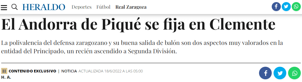 Parece que la prioridad del Real Zaragoza es buscar una nueva cesión a Enrique Clemente y se apunta como posible destino el FC Andorra de Gerard Piqué.