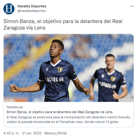 Dentro de la política de colaboración entre clubes que quieren implantar los nuevos propietarios del Real Zaragoza aparece el nombre del delantero francés Simón Banza que esta temporada ha jugado cedido por el Lens en el Familicão de la Liga portuguesa con el que ha marcado 14 goles y ha dado 6 asistencias en 31 partidos.