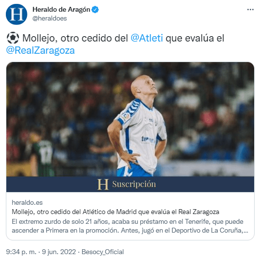 Un mercado de fichajes más aparece el nombre de Víctor Mollejo como posible fichaje del Real Zaragoza. Pertenece al Atlético de Madrid y esta temporada ha jugado cedido en el CD Tenerife donde ha marcado 3 goles en 37 partidos de Liga. Anteriormente también fue cedido al Real Mallorca, Getafe y Deportivo de la Coruña.