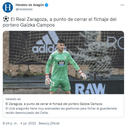 A falta de confirmación oficial, se da por cerrado el fichaje del portero Gaizka Campos que se encontraba sin equipo tras finalizar su contrato con el Celta de Vigo. El guardameta de 25 años ha jugado esta temporada en el filial del conjunto gallego en Primera RFEF donde ha encajado 39 goles en 32 partidos.
