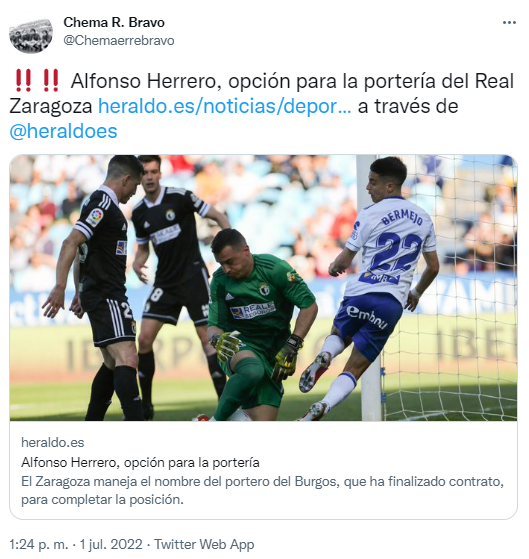 Alfonso Herrero es otra de las opciones para la portería del Real Zaragoza. El guardameta se encuentra libre tras terminar su contrato con el Burgos donde ha jugado 29 partidos y ha encajado 31 goles.
