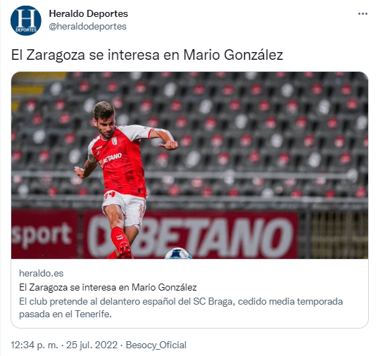 El Real Zaragoza se interesa en el delantero Mario González que pertenece al SC Braga. La segunda vuelta de la temporada pasada jugó cedido en el CD Tenerife donde marcó 5 goles en 20 partidos.