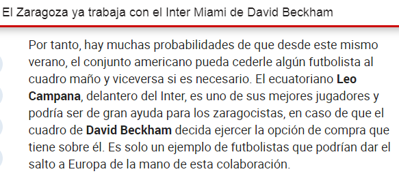 El 21 de mayo tras la visita a La Romareda del Director Deportivo del Inter Miami, Chris Henderson, el diario Marca informó que el delantero Leo Campana podría ser una opción para el ataque del Real Zaragoza. Esta temporada ha marcado 7 goles en 15 partidos.
