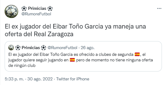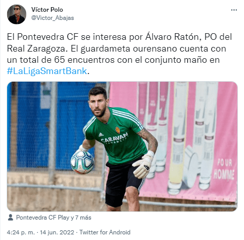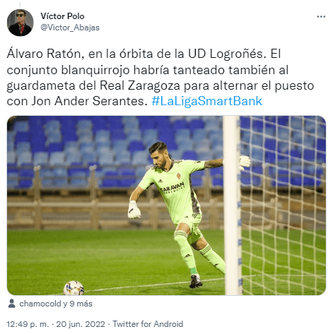Otros medios informan que Álvaro Ratón continuara en el Real Zaragoza la próxima temporada pero Víctor Abajas señala a la UD Logroñes como posible destino del guardameta.
