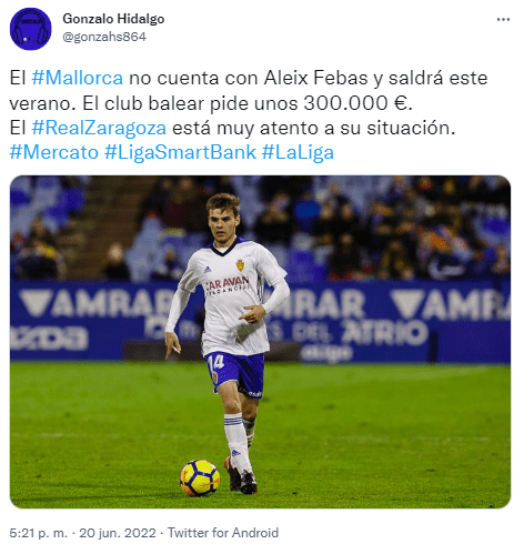 Se podría dar un regreso en el Real Zaragoza. El Real Mallorca está buscando una salida a Aleix Febas. Esta temporada ha jugado la segunda vuelta de la competición cedido en el Málaga donde ha disputado 19 partidos, ha marcado 1 gol y ha dado 2 asistencias.