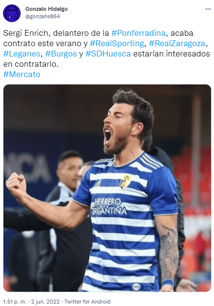 El delantero Sergi Enrich se incorporó a la SD Ponferradina con la temporada comenzada. Ha jugado 32 partidos donde ha aportado 6 goles y 5 asistencias. Gonzalo Hidalgo informa que hay varios clubes de Segunda División interesados en su contratación entre los que está el Real Zaragoza.