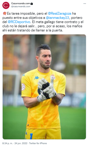 Cazurreando informa del interés en el portero del Deportivo de la Coruña Ian Mackay pero indica que la operación es muy complicada. El guardameta de 35 años ha jugado esta temporada 37 partidos y ha encajado 32 goles.