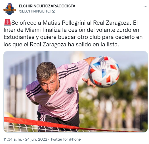 El 22 de junio se informó en Argentina de que Matías Pellegrini no seguiría en Estudiantes de la Plata. El jugador cedido por el Inter Miami se marcharía a España o México. Las sinergias prometidas entre los clubes propiedad de los nuevos mandatarios del Real Zaragoza colocó al club aragonés como su posible destino. El extremo fichó por el Inter en 2019 a cambio de 8,2 millones. Esta temporada ha jugado 23 partidos y ha marcado 2 goles.