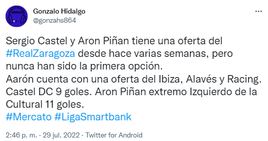Cazurreando informa que el Real Zaragoza se ha interesado en dos jugadores del Ibiza, el defensa central Rubén González que ha jugado 27 partidos, ha marcado 1 gol y ha dado 1 asistencia y el centrocampista Manu Molina que ha jugado 40 partidos y ha dado 3 asistencias de gol.